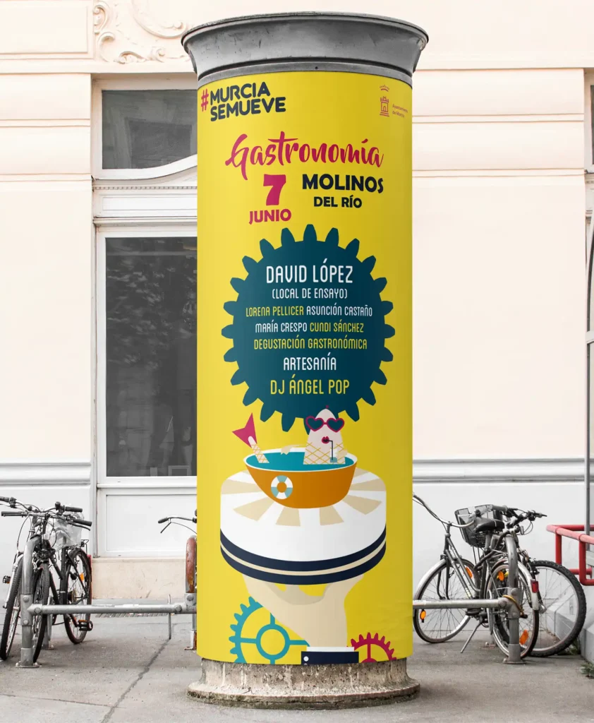 Diseño campaña publicitaria. Trabajo como responsable de diseño y dirección para el Ayto. de Murcia. Elementos gráficos de todo el festival, cartelería en varios formatos, mupis, banners, videos animados en 2D, campaña de instagram, etc.